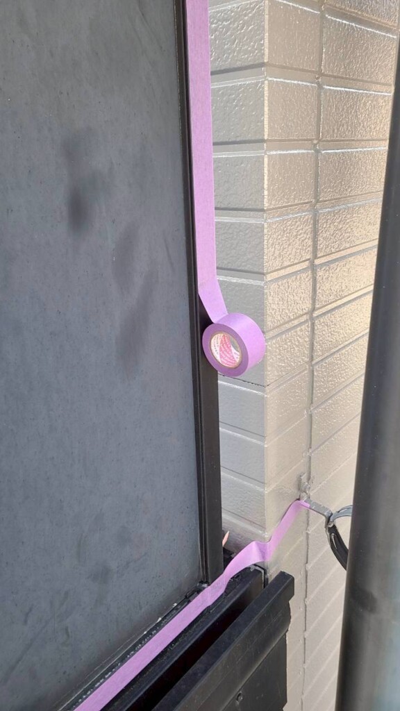 ライン出しを求められるサッシなどには必ず紙テープを貼った後にマスカー(ガムテープにビニール)を貼ります!