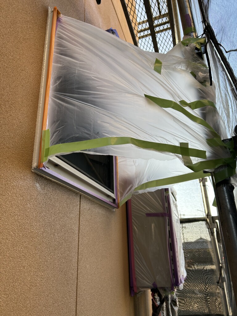 足場の都合次第にはなってしまいますが、お風呂場の窓も換気出来る様に養生しました。