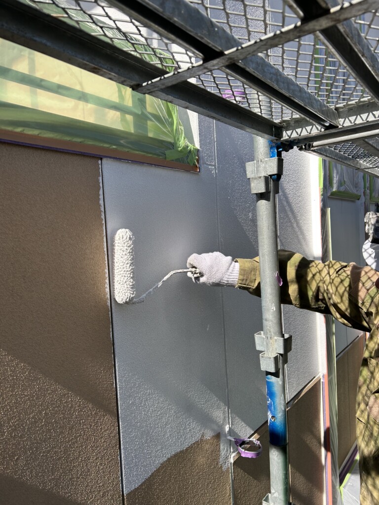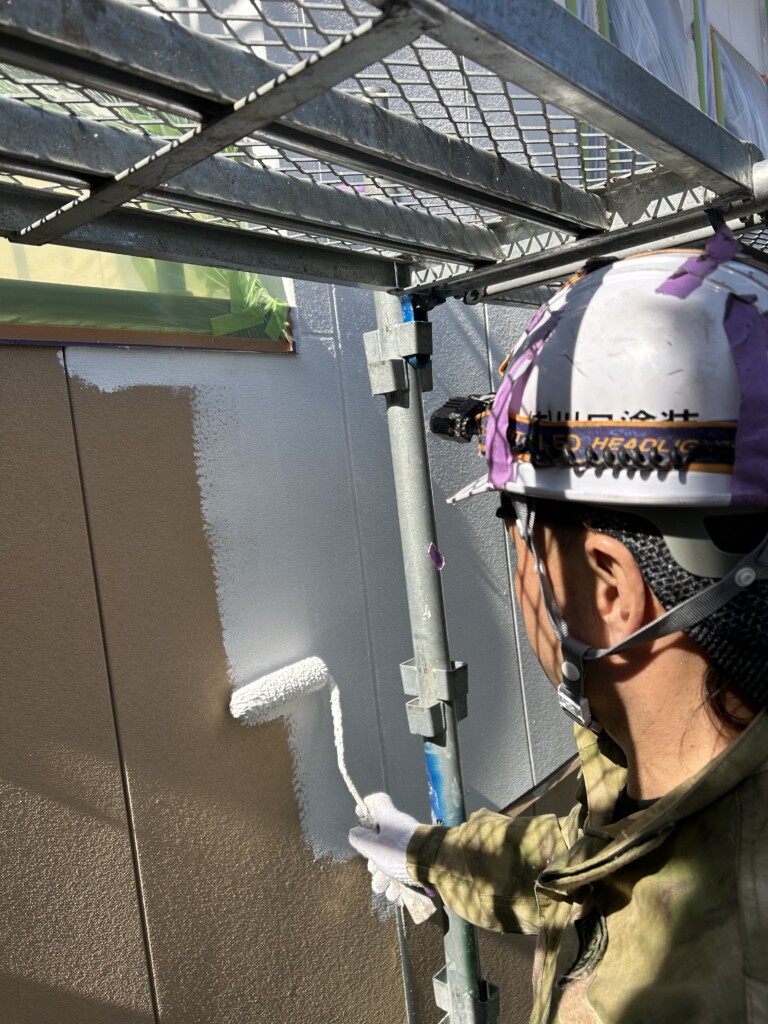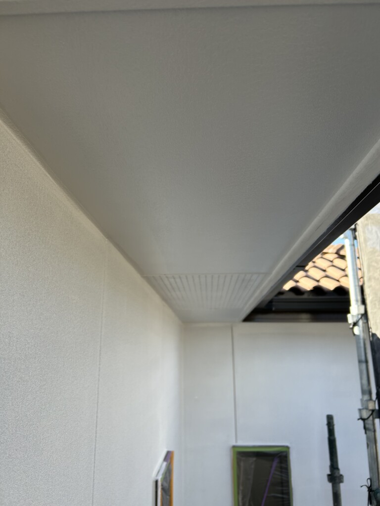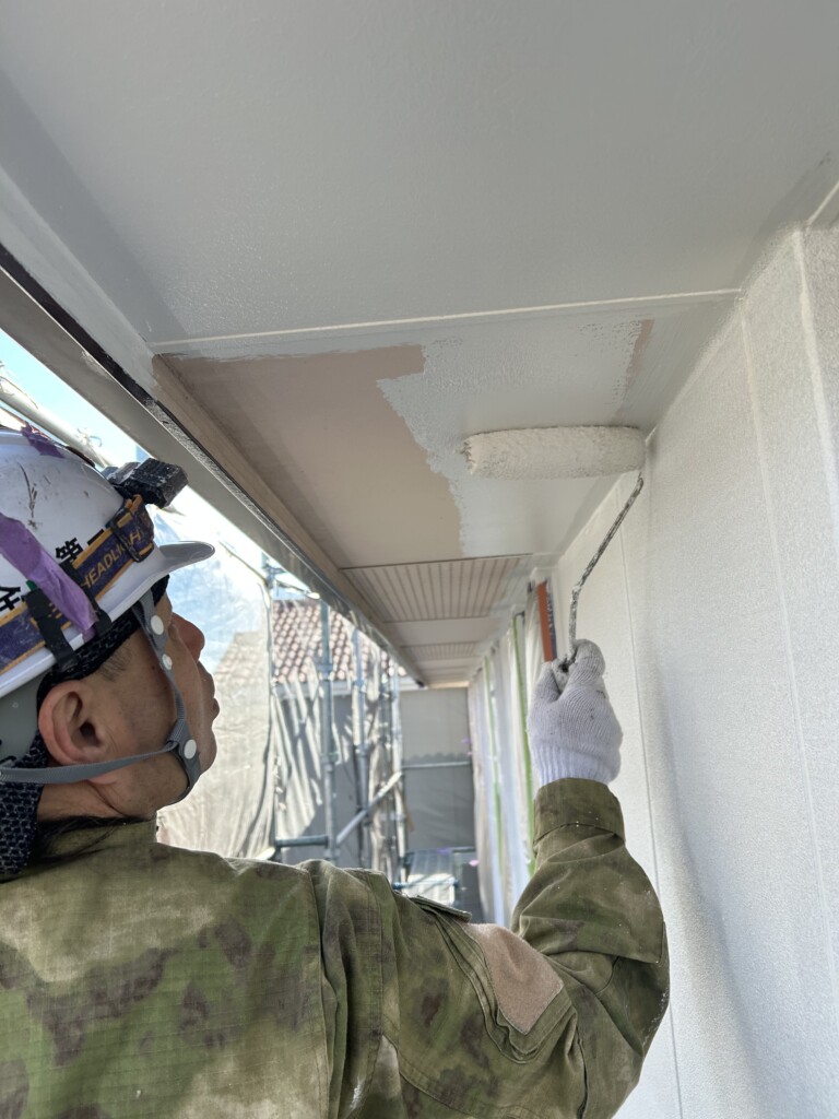 本日は軒天の塗装と外壁の下塗り作業です。